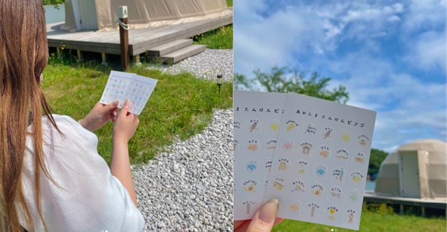 青島に存在する生き物などをイラストにしたビンゴ。島内を探検しながらイラストと同じものを見つけたら穴あけチャンス。見事ビンゴになったら素敵な景品が。