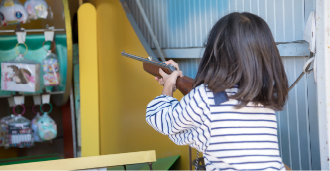 昔懐かしい射的コーナー。お菓子を狙って倒したら見事景品ゲット!